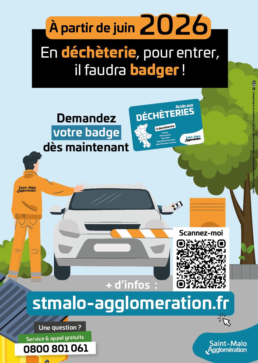 Dès juin 2026, les habitants des 18 communes de Saint-Malo Agglomération devront s’équiper d’un badge pour se rendre dans les cinq déchèteries de l’Agglomération (Cancale, Miniac-Morvan, Saint-Malo, Saint-Méloir-des-Ondes et Saint-Père-Marc-en-Poulet). Ce nouveau moyen d’accès peut être obtenu gratuitement dès à présent et pourra être utilisé de manière illimitée.