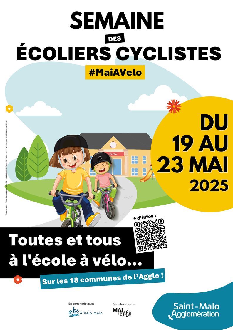 Dans le cadre de l’évènement national "Mai à Vélo : un mois pour adopter le vélo pour la vie", soutenu par le Ministère de la Transition écologique et le Ministère des sports, Saint-Malo Agglomération et l'association A Vélo Malo invitent les écoles primaires des 18 communes de l’agglomération à participer à la "Semaine des écoliers cyclistes", du 19 au 23 mai prochain.