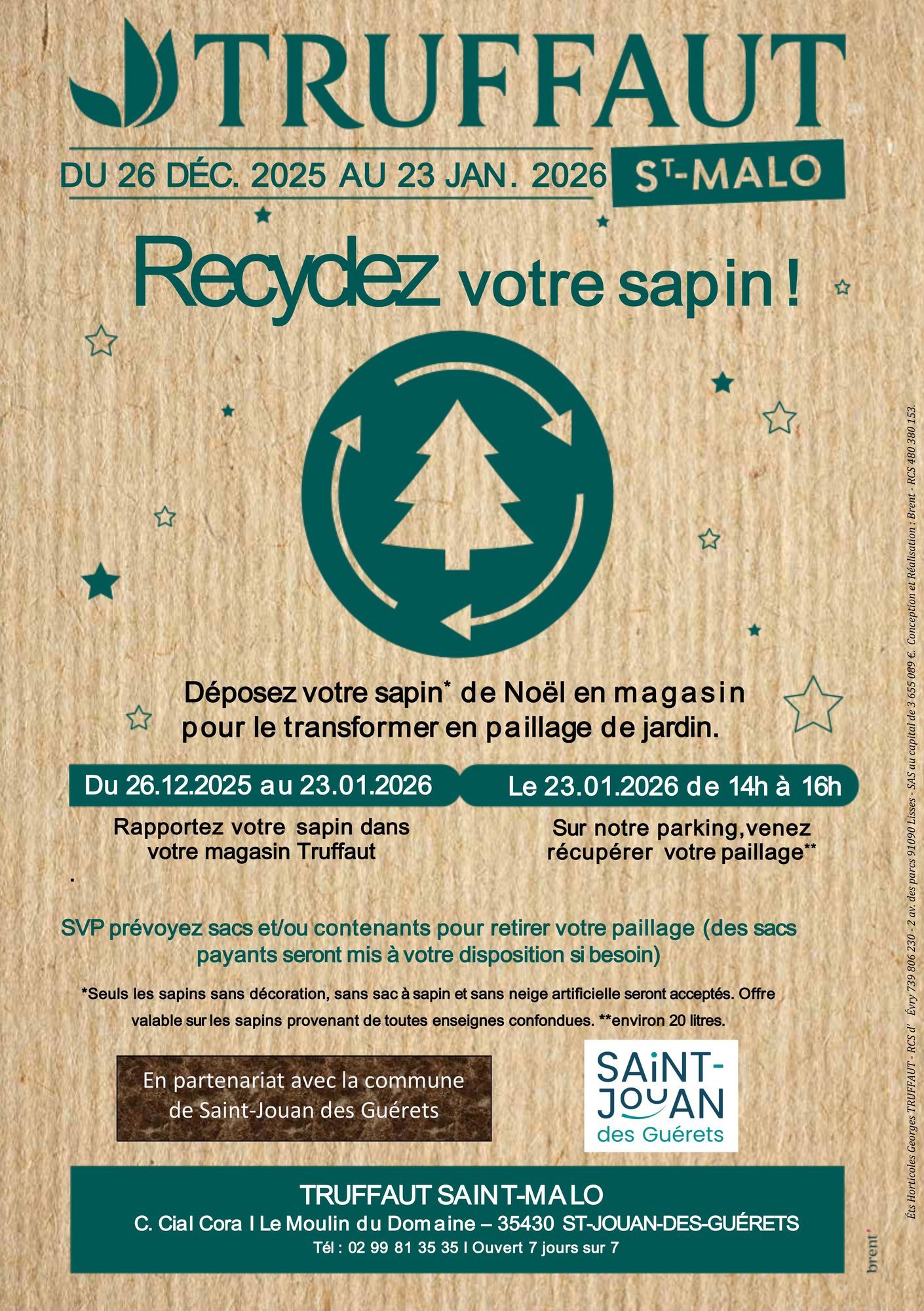 L'enseigne Truffaut et la commune vous invitent à déposer votre sapin de Noël* au magasin Truffaut du 26 décembre 2025 au 23 janvier 2026.