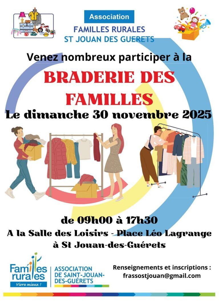 Jouets, vêtements, livres, bibelots... L'association Familles Rurales de Saint-Jouan vous invite à une nouvelle édition de sa "braderie des familles". Rendez-vous dimanche 30 novembre de 9h à 17h à la salle des loisirs.