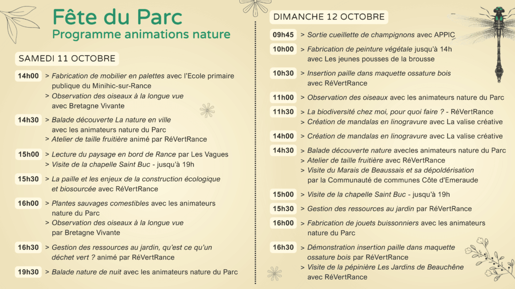 Les 11 et 12 octobre, la grande fête du Parc Naturel Régional Vallée de la Rance - Côte d'Émeraude aura lieu au Minihic-sur-Rance.