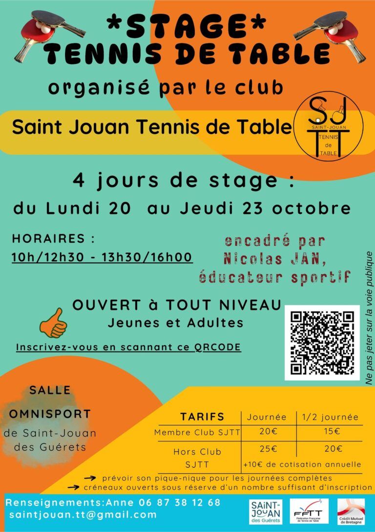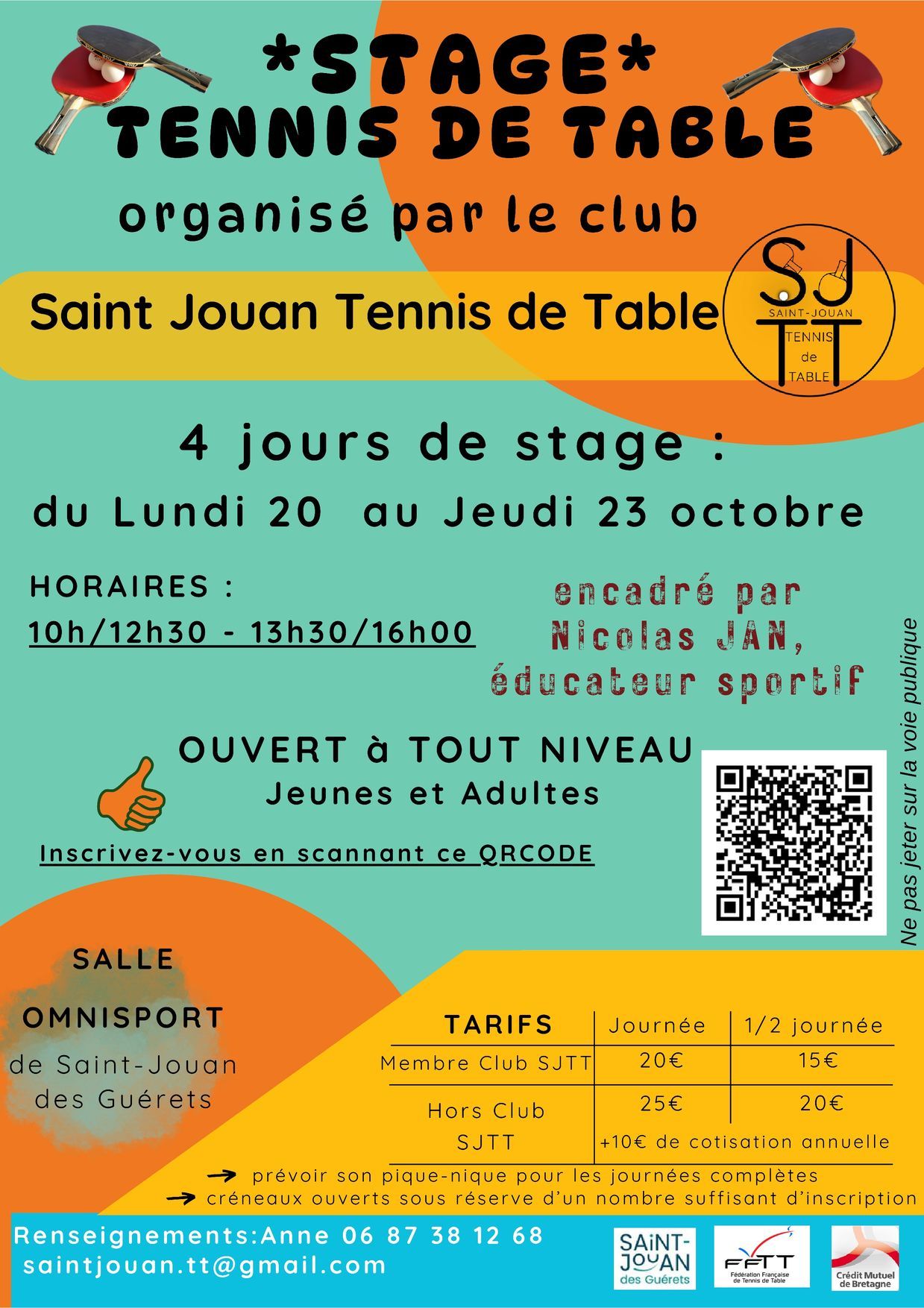 Organisé par l'association Saint-Jouan tennis de table, ce stage est ouvert à tous les niveaux de jeu et à tous les âges. Il sera encadré par Nicolas JAN, éducateur sportif.